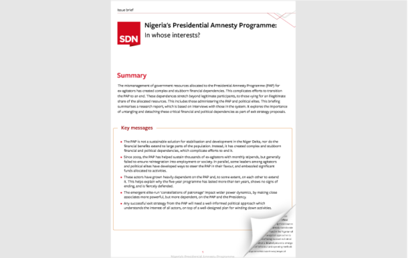In whose interests? The mismanagement of government resources allocated to the Presidential Amnesty Programme (PAP) for ex-agitators has created complex and stubborn financial dependencies. This complicates efforts to transition the PAP to an end. These dependences stretch beyond legitimate participants, to those vying for an illegitimate share of the allocated resources. This includes those administering … Continue reading Brief: Nigeria’s Presidential Amnesty Programme